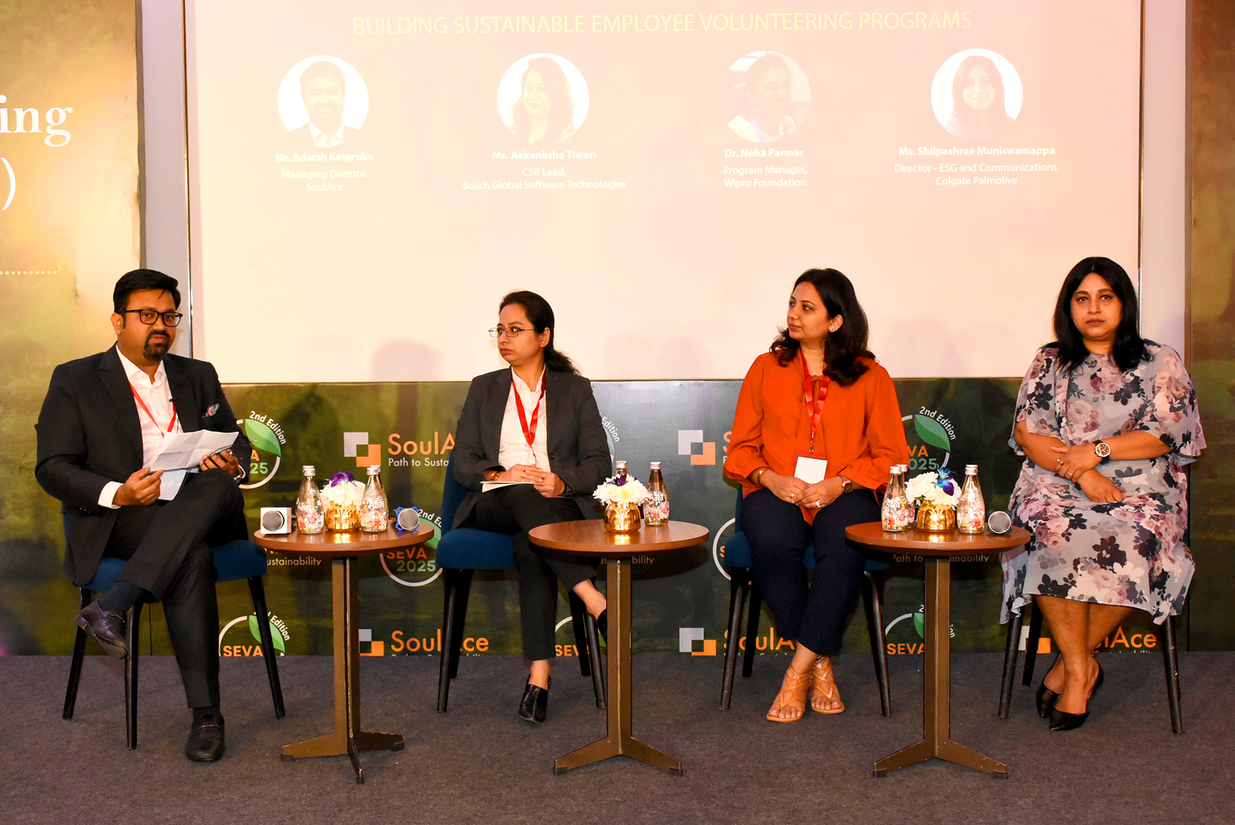 The panel discussion on Building Sustainable Employee Volunteering Programs focused on how organisations can design, implement, and sustain impactful volunteering initiatives. Moderated by Mr Adarsh Kataruka, Managing Director, SoulAce, the panel included Ms Aakanksha Tiwari, CSR Lead, Bosch Global Software Technologies, Dr Neha Parmar, Program Manager, Wipro Foundation, and Ms Shilpashree Muniswamappa, Director ESG and Communications, Colgate-Palmolive.