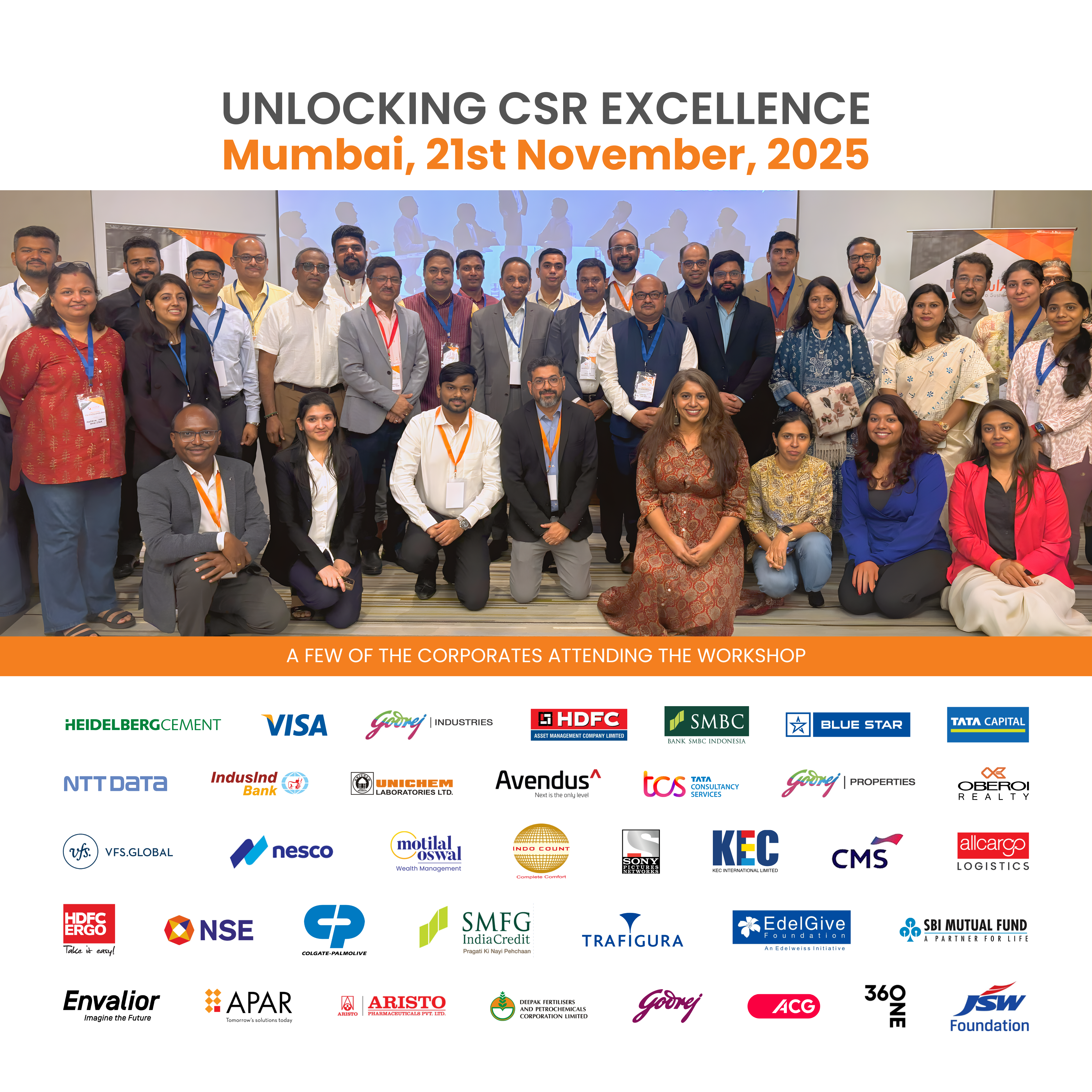 The workshop saw participation of CSR leaders from organisations such as ACG, 360 One, All Cargo Logistics, Apar Industries, Aristo Pharma, Avendus, Blue Star, Colgate Palmolive,CMS Info Systems, Deepak Fertilizers, Edelgive Foundation, Godrej Enterprises, Envalior,Godrej Industries, Godrej Properties, HDFC AMC, HDFC ERGO, Heidelberg Cement,Indo Count, JSW Foundation, IndusInd Bank, IndoCount Industries, Motilal Oswal, Nesco, KEC International, NSE, NSE Foundation, Oberoi Reality , SMBC, SMFG, NTT Data Services, Tata Capital TCS, SBI Mutual Funds, Sony, Trafigura, VFS Global, Visa, Unichem Labs, Oberoi Reality.